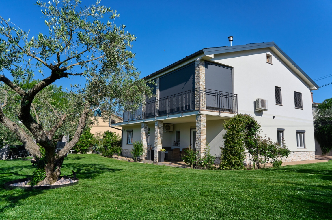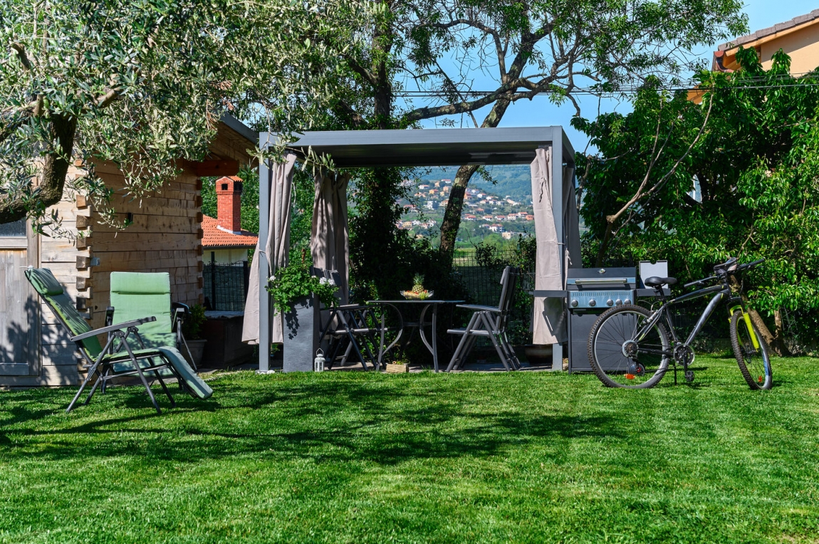 Na prostem vas pričaka zasebna terasa in vrtni paviljon z lounge garnituro in žarom, obdan z velikim mediteranskim vrtom – idealno za sproščene trenutke, igre na prostem ali večere pod zvezdami.